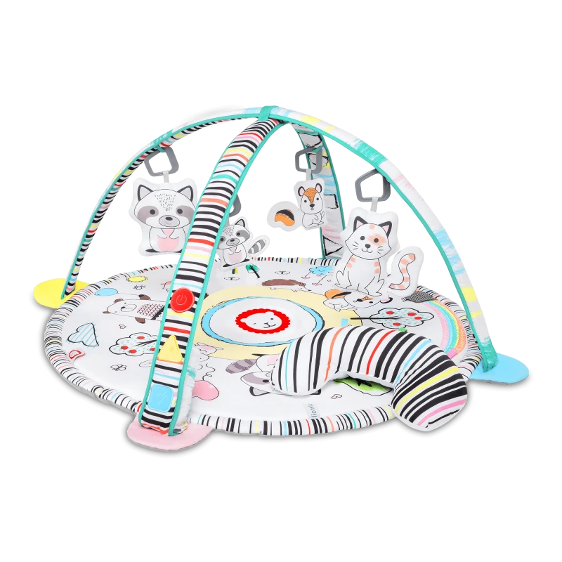 Toy bars provided with the playmat has been equipped with LED light panels with 2 display modes. The arrangement of interactive toys on toys bars can be changed in different ways, they can also be completely dismantled. The product has been equipped with a panel enabling to play recorded sounds and melodies and to adjust their volume. The set also includes Tummy Time cushion which supports the youngest children in their exercises when they lay down on the belly.