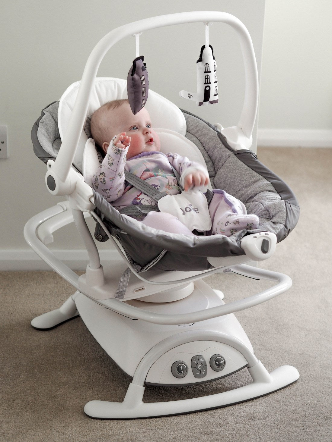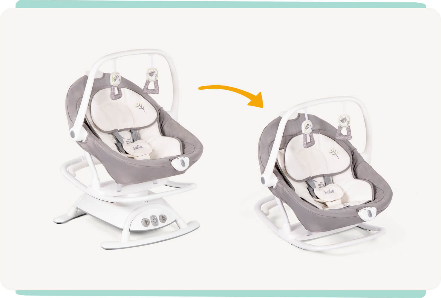Pivoting carry handle to easily lift rocking seat so you can bring baby along to another room in the house