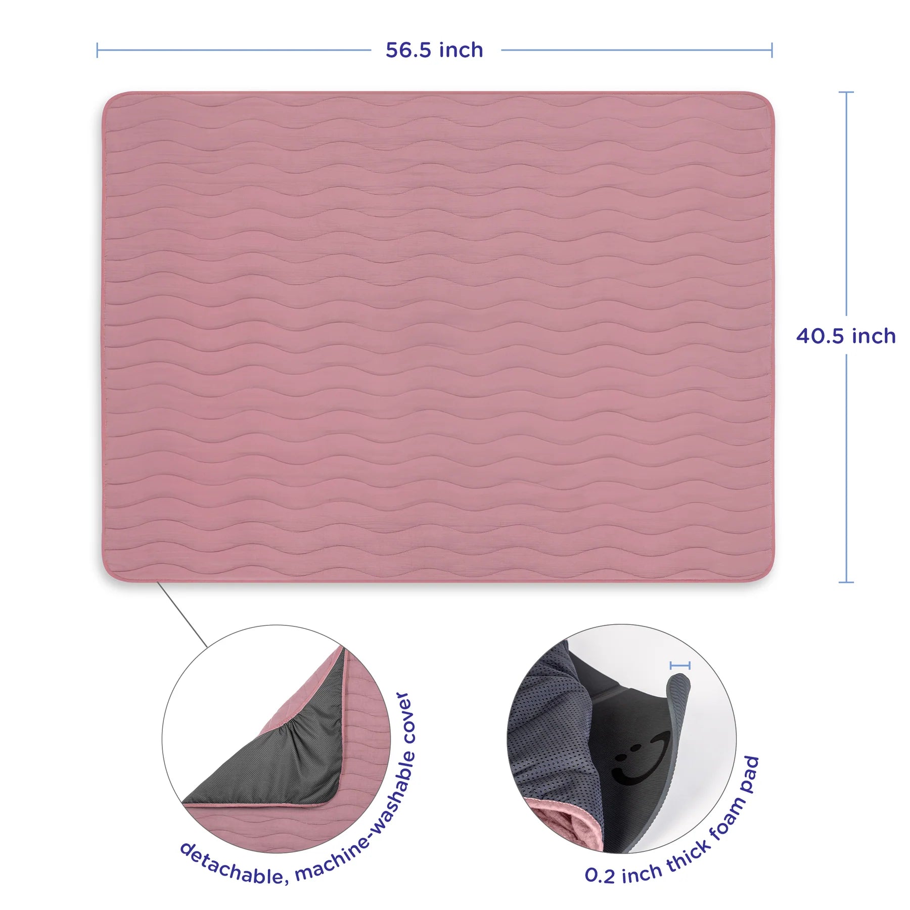 · Designed with a plush foam play mat insert, this padded infant playmat creates a soft and cushioned surface for babies and toddlers to roll, sit, and crawl safely. The sturdy non-slip padded mat backing stays securely in place on hard floors, preventing shifting and sliding during active play. · The ultra soft natural cotton muslin fabric cover offers a gentle, breathable touch, perfect for baby’s delicate skin. This machine washable cover is a breeze to keep clean for daily use. · The removable muslin cover is machine-washable for stress-free cleaning, ensuring a fresh and hygienic play area for your baby. Easily fold and store the play mat for convenient storage or travel, making it ideal for home, daycare, or on-the-go playtime. · This large baby play mat boasts a generous size of 40.5" x 56.5", accommodating tiny newborns to curious toddlers. The foldable kids play mat and infant tummy time mat is a great fit for baby playpens and baby tents for indoor or outdoor use.